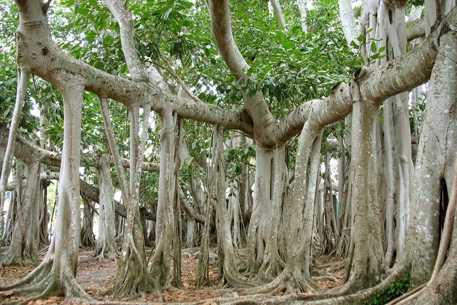 Все происходит следующим образом: сначала вырастает одно единственное дерево, из ветвей которого вытягиваются отростки, тянущиеся обратно к земле.