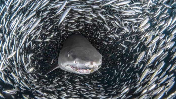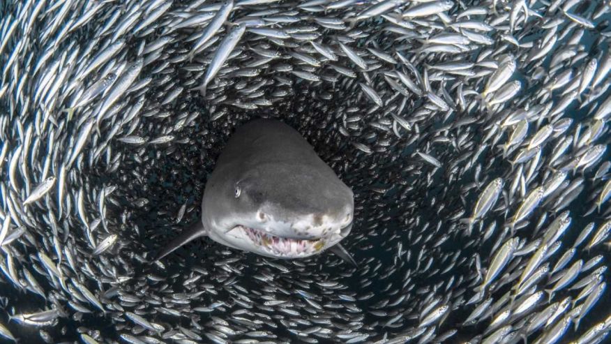 Подводный фотограф Таня Хопперманс запечатлела потрясающее «рыбное торнадо», окружающее песчаную тигровую акулу у берегов Северной Каролины. На фотографиях видно, как анчоусы, объединяясь, создают так называемый «bait ball» (шарик прикормки). Таким образом рыбы защищаются от нападения хищника, который не может разбить их строй.